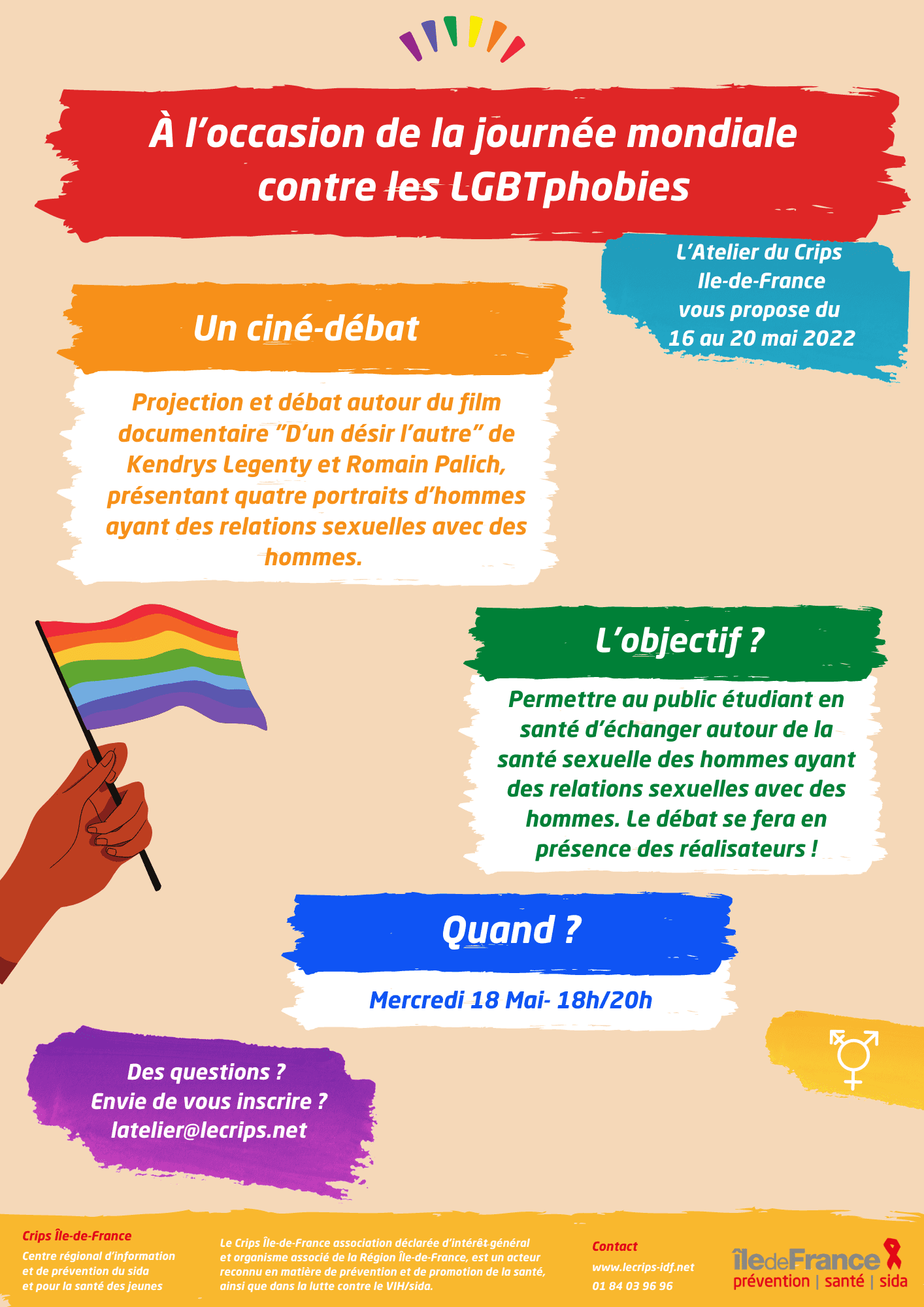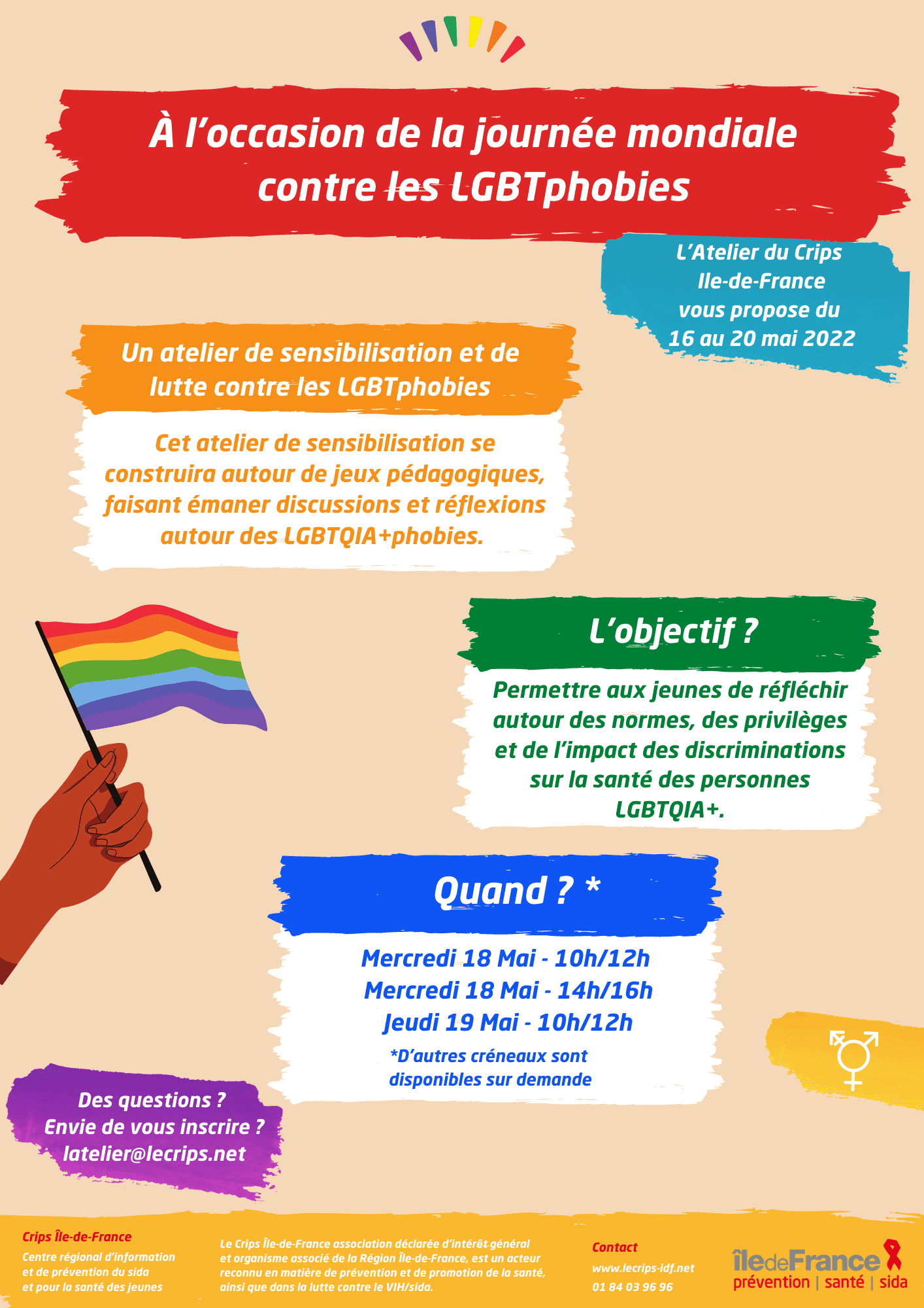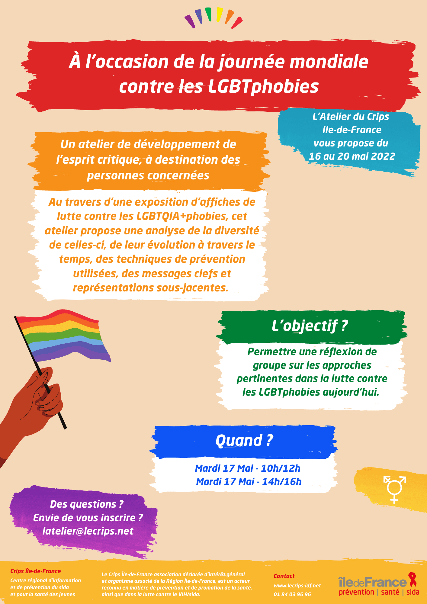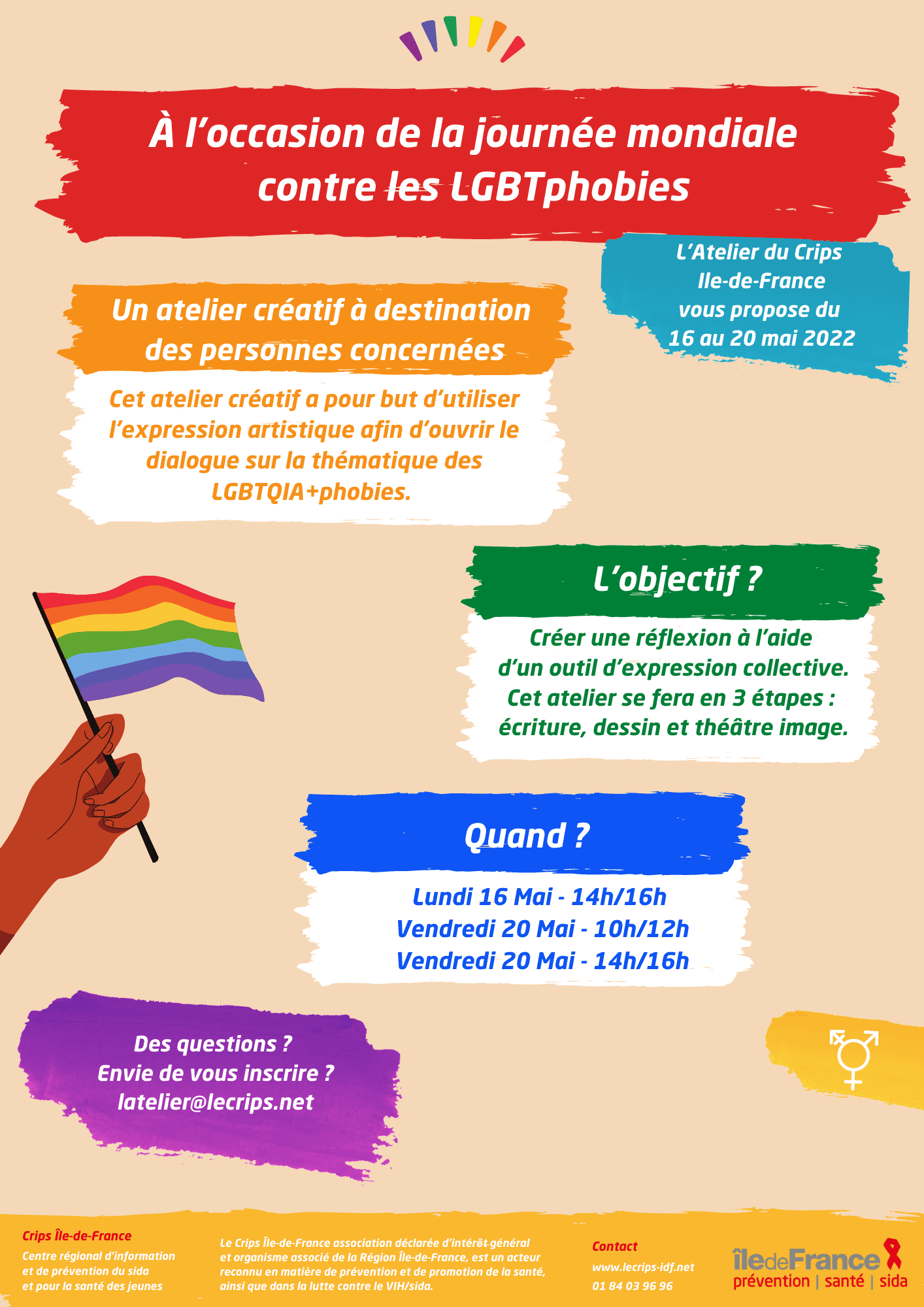 Du 16 au 20 mai 2022, l’Atelier du Crips Île-de-France propose quatre activités de groupe pour aborder les LGBTphobies. L’inscription pour un groupe se fait par le responsable du groupe. Vous pouvez inscrire un même groupe à plusieurs activités.
