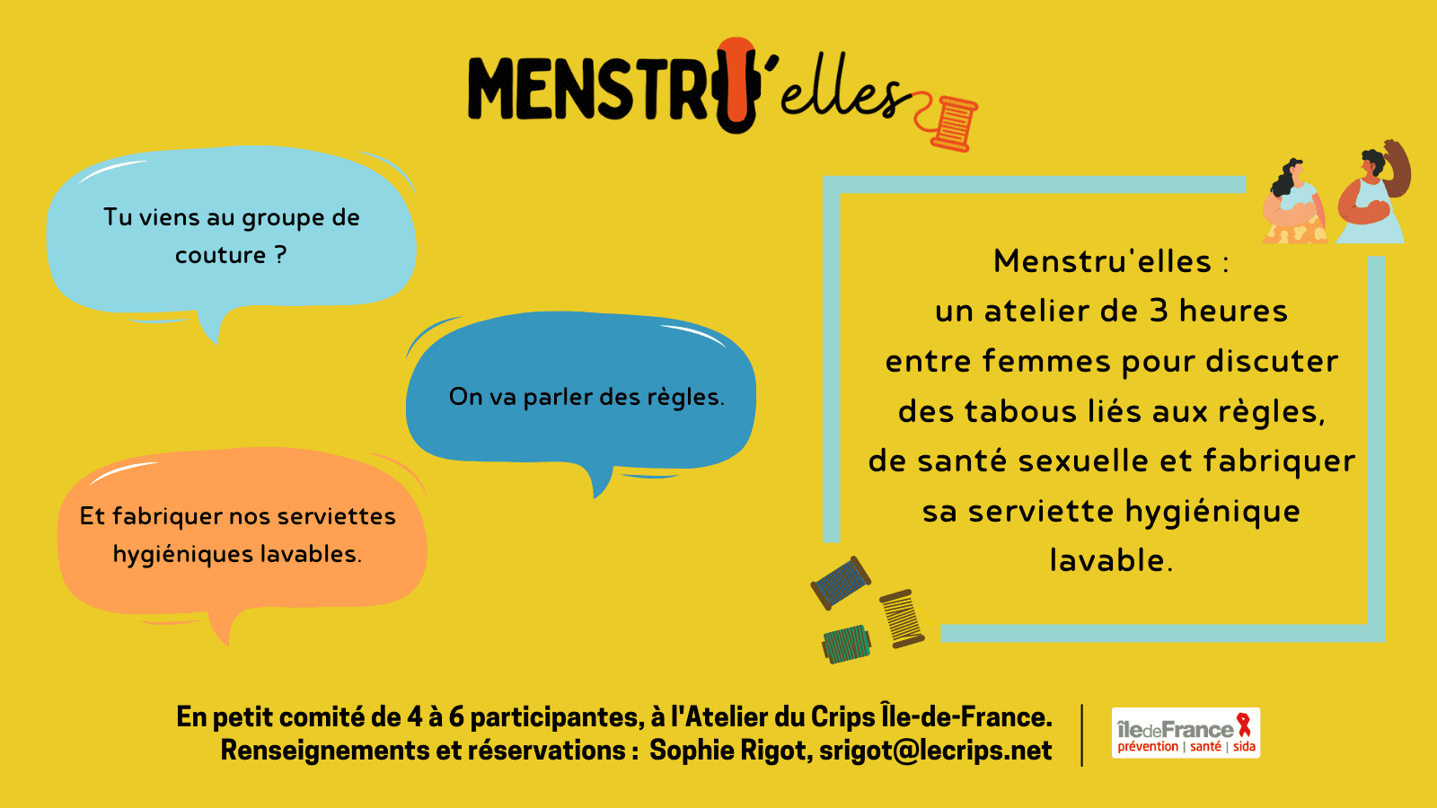 Pour tout renseignement complémentaire sur les ateliers Menstru’elles ou réserver une séance (groupes de 4 à 6 participantes) :