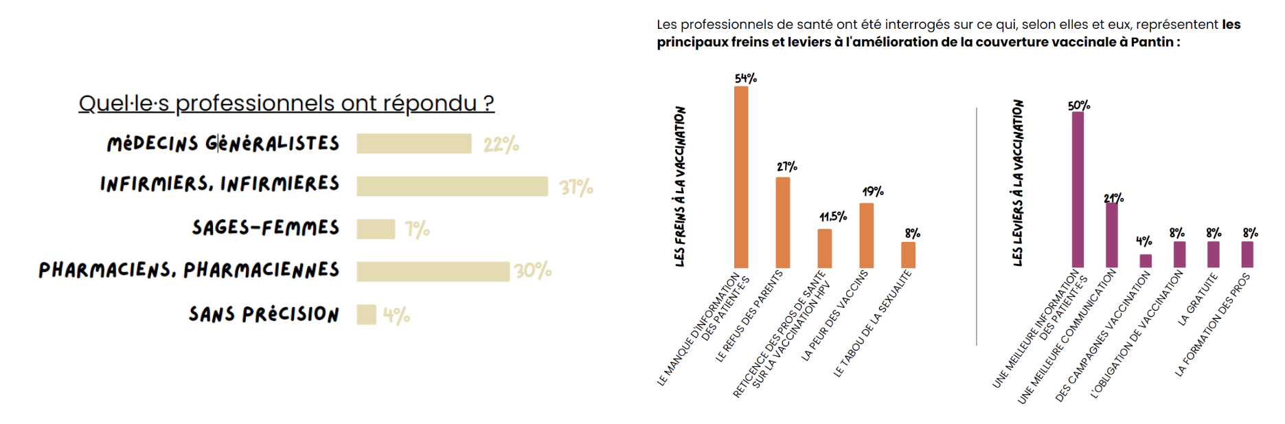 L’état des lieux réalisé a permis de mettre en évidence les freins et contraintes pouvant exister ainsi que les différentes pistes d’actions pour améliorer la couverture vaccinale HPV chez les jeunes de Pantin.