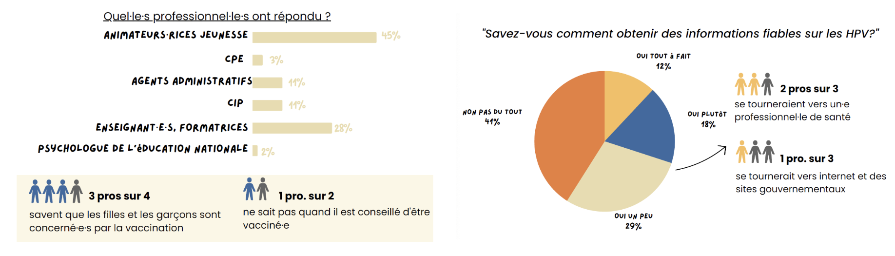 • Enfin, 74% des professionnels du social et de l’éducation abordent les questions de santé sexuelle. Pourtant, par manque d’informations suffisantes, 54% n’abordent jamais les HPV.