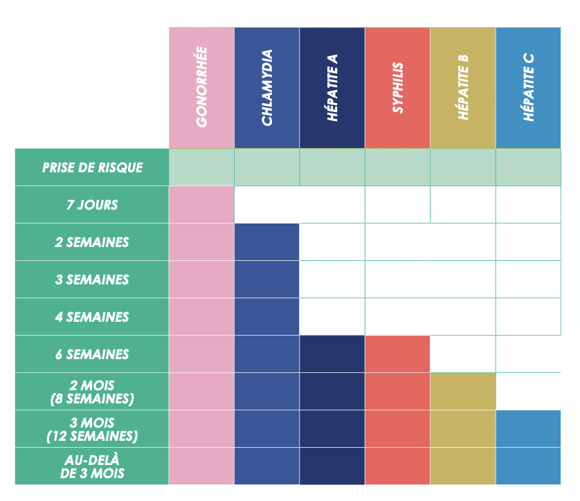 Il est possible de se faire dépister entre deux et trois semaines après l’exposition, selon le type d’infection et les circonstances de contamination. A titre indicatif, ce tableau présente les délais de dépistage de certaines IST. En ce qui concerne le VIH, certains tests peuvent déjà voir les signes de l’infection. Les tests rapides d’orientation au diagnostic peuvent donner des informations de manière précoce à partir de 3 semaines. Mais il est nécessaire de refaire un test au bout de 6 semaines après la prise de risque pour avoir un diagnostic définitif.