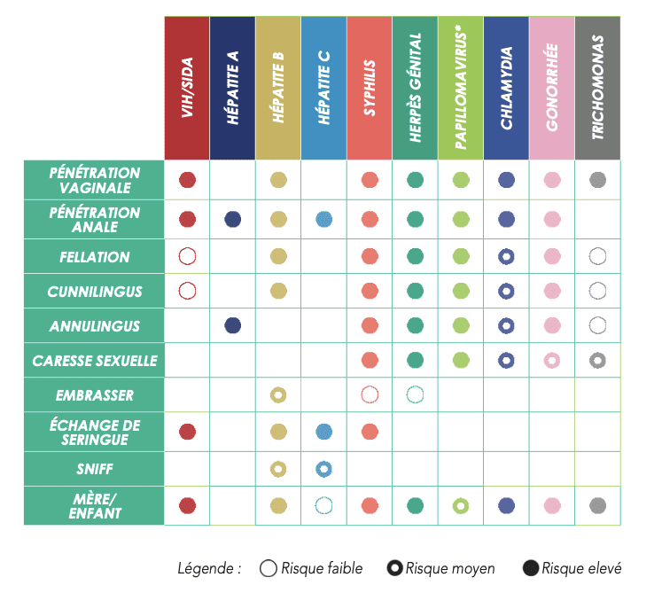 Si certains modes de transmission sont bien connus et évalués, il reste difficile d’en classer l’ensemble selon une échelle des risques définitive. Ce tableau résume l’état des connaissances en 2021. Il est donc important de discuter des risques et des modes de transmission avec son ou sa médecin, qui prendra en compte le contexte, unique forcément, de la personne.