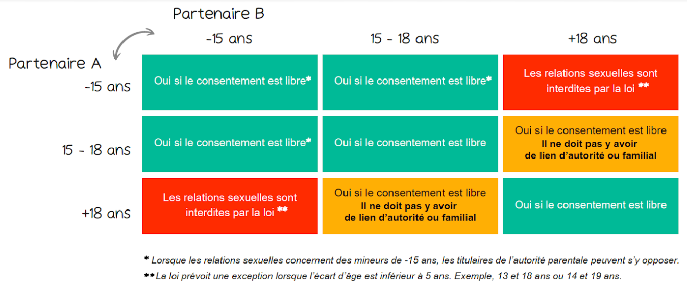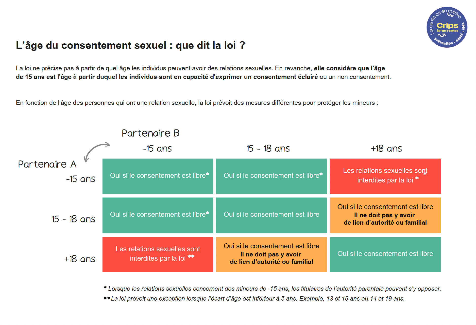 Le consentement doit être enthousiaste et libre. Par exemple, si la personne ne souhaite pas de rapport sexuel mais n’est pas en capacité de dire non ou n’arrive pas à dire non (exemple : pression de sa ou son partenaire, état d’inconscience ou de sidération, chantage affectif), il n’y a pas consentement.