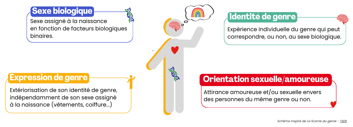 Le genre concerne sa relation à soi, ce qui est propre à chacun. Il faut le distinguer de l’orientation sexuelle qui concerne sa relation aux autres. L’orientation sexuelle et amoureuse concerne l’attirance envers les personnes.